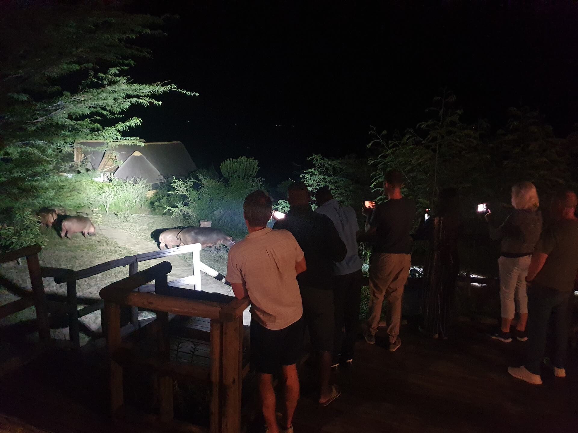 Und auch zurück im Camp geht das Aben­teuer mit­un­ter wei­ter. Bei uns: Nach­mit­tags Vogel­ge­sänge, am Abend schlen­derte eine ganze Gruppe Fluss­pferde (!) an unse­rem (von Ran­gern gesi­cher­ten) Lager­feuer vor­bei, nachts heul­ten abwech­selnd die Löwen und Hyä­nen. Wow!